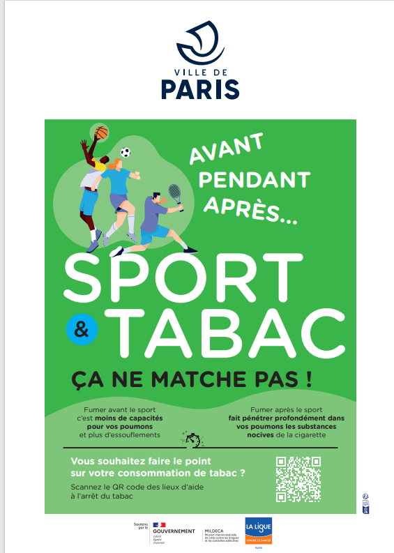 Affiche Sport et tabac ça ne matche pas ! pour sensibiliser les usagers des équipements sportifs.
